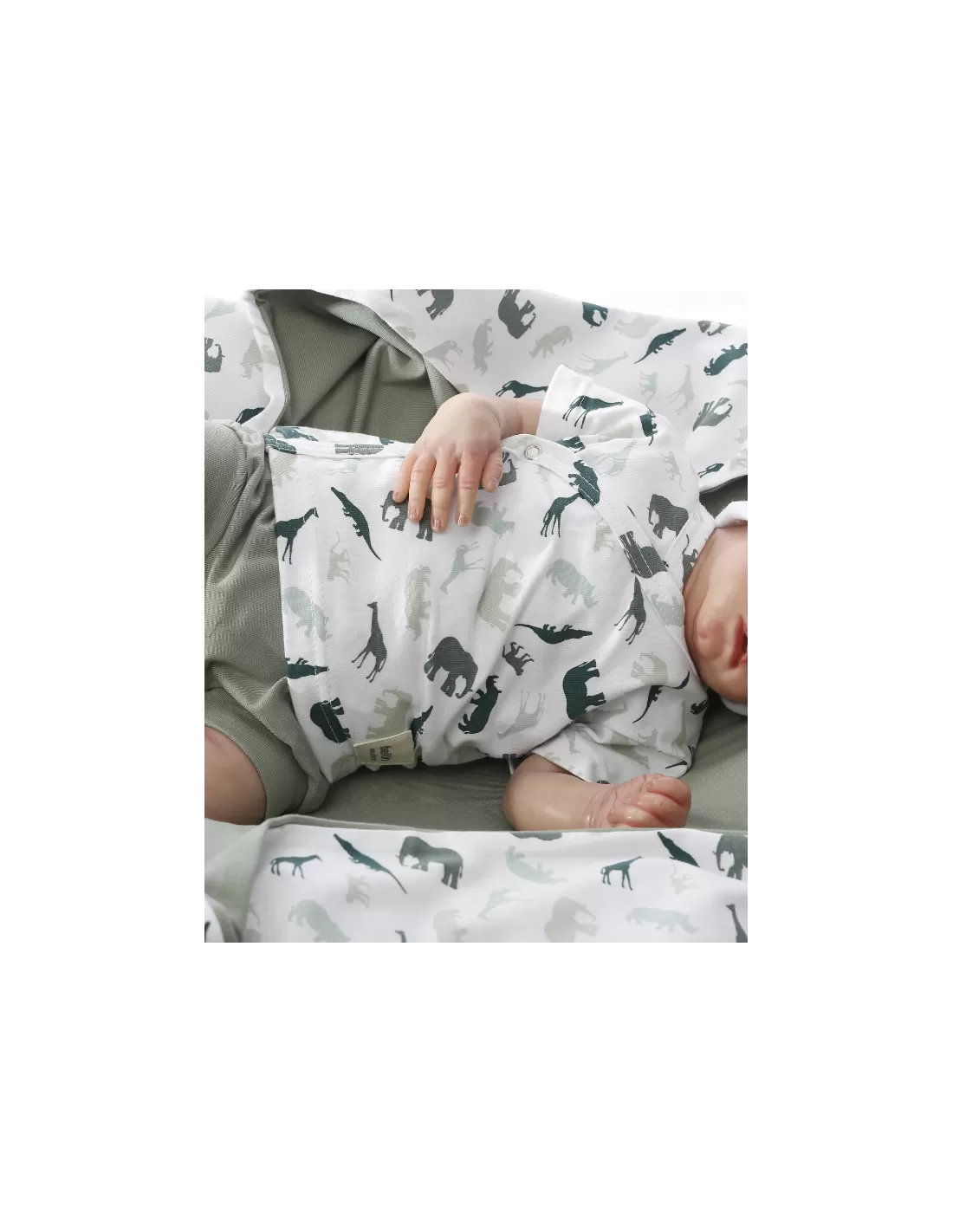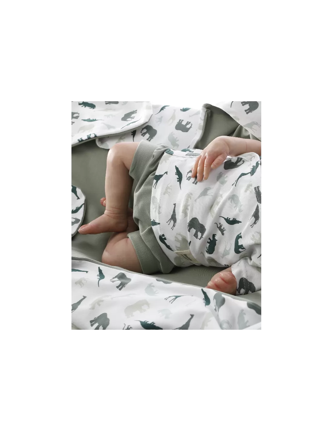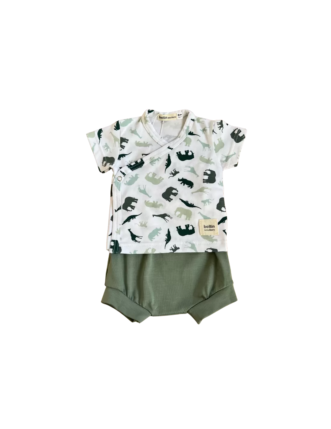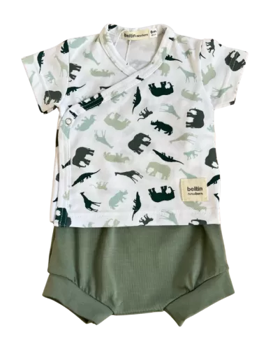 Chambrita cruzada en manga corta. En color blanco con estampado de animales de la sabana en color verde con diferentes tonalidades .