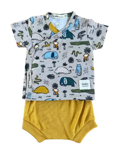 El estampado de la chambrita no puede ser más mono! con la representación de todos los animalitos de la selva. El bloomer en color mostaza a juego con los colores de la chambrita. Conjunto para recién nacido unisex.