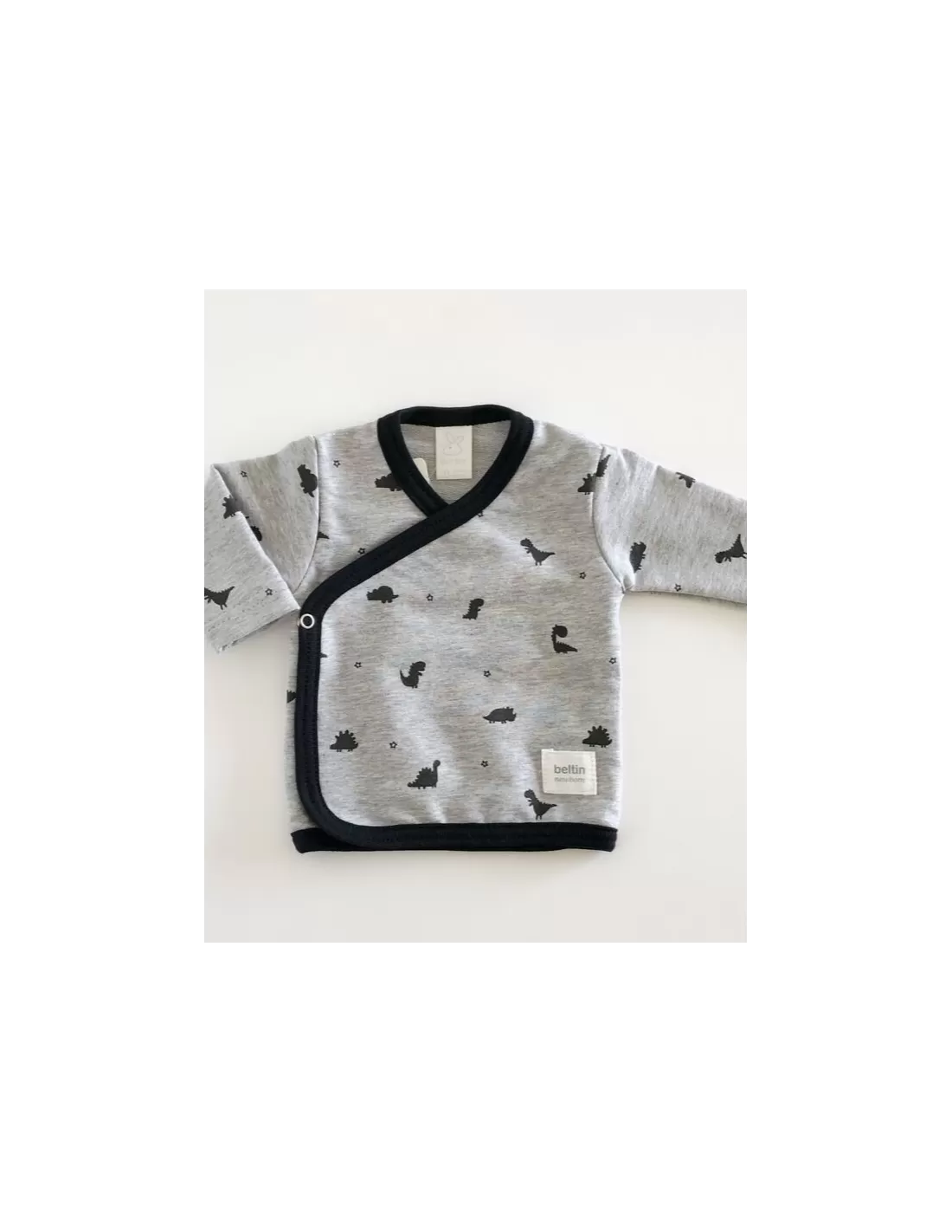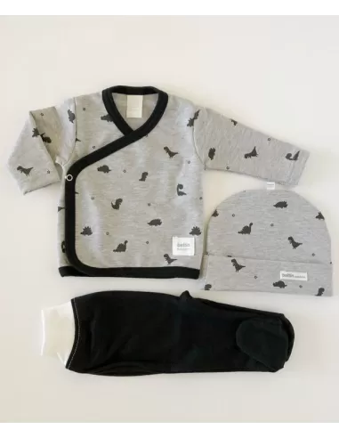 Primera puesta. Conjunto de chambrita cruzada manga larga en gris jaspeado con polaina en color negro a juego con los pequeños dinos de la chambrita y el gorrito. 100% algodón, muy cómoda, con un tacto muy agradable para el bebé recién nacido. Confeccionada en felpa ligera de algodón. En talla 0M y 1M. La chambrita se abrocha por delante cómodamente con broches totalmente libres de níquel. Fácil de lavar y de secar. Totalmente transpirable. Colores duraderos lavado tras lavado. 100% made in Spain.