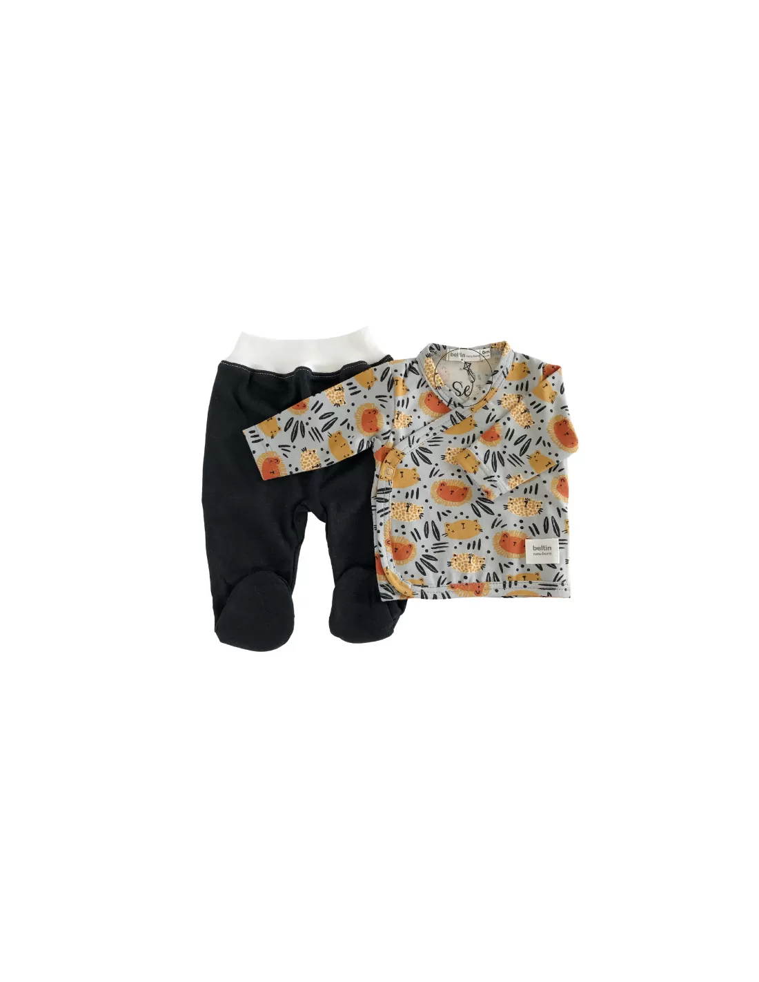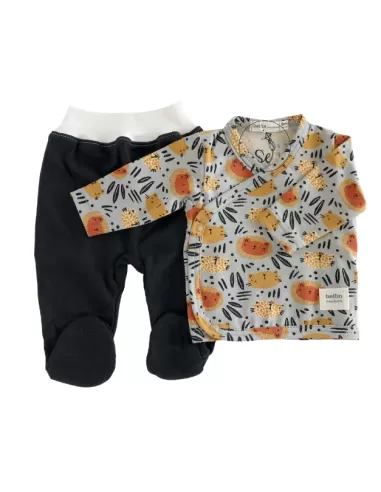 El estampado de la chambrita te enamorará con sus tiernas caras de leones y tigres sobre un fondo gris con un toque azulado. La polaina del conjunto es en color negro. Conjunto para recién nacido unisex.