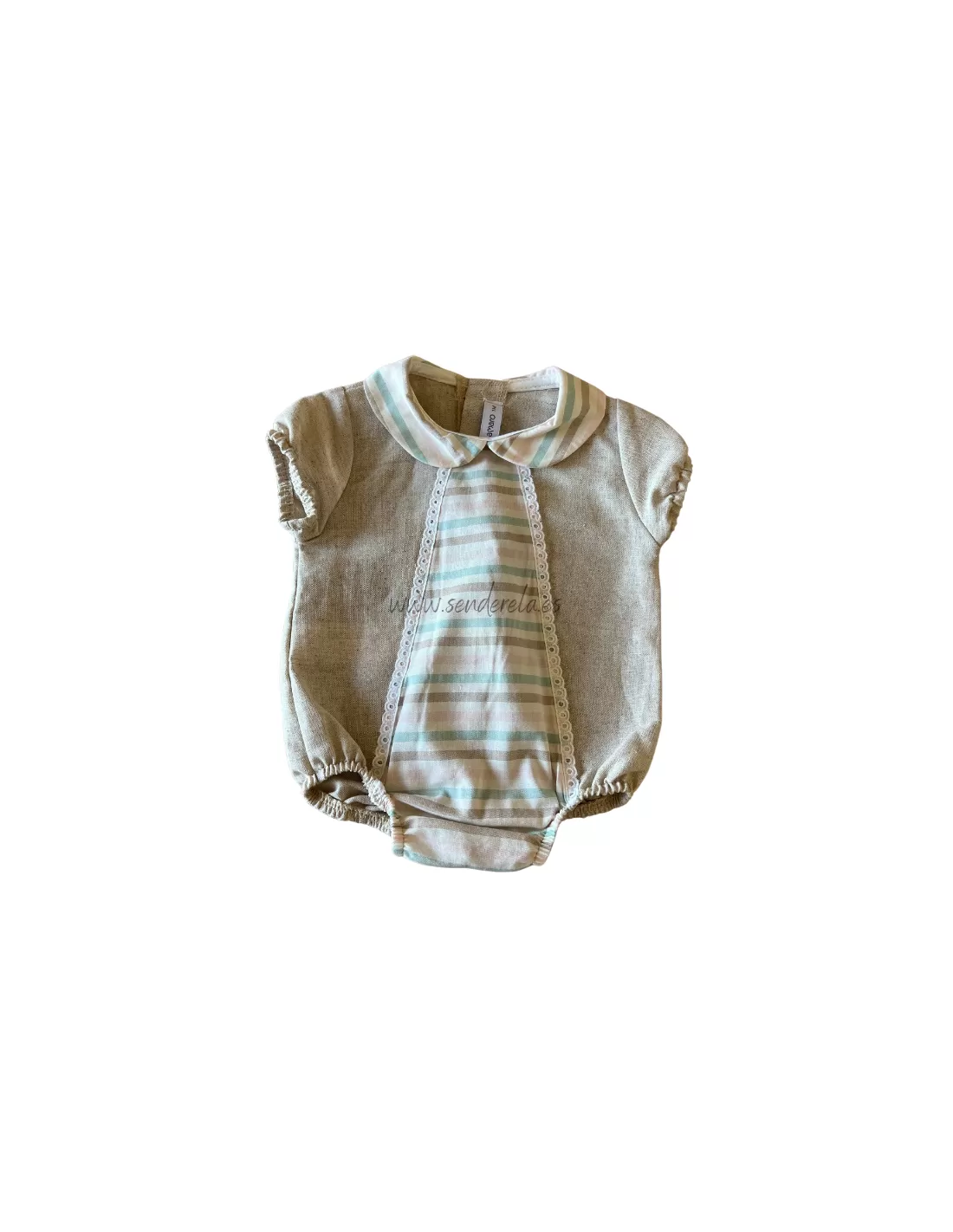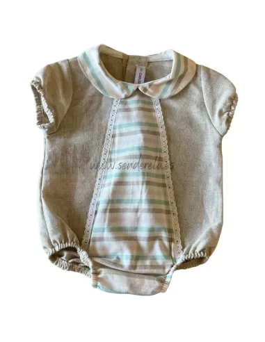 En color arena y estampado de finas lineas en tonos pastel: arena, crudo, verde y rosa hace que este pelele sea elegante y fresco para vestir al bebé en cualquier ocasión.